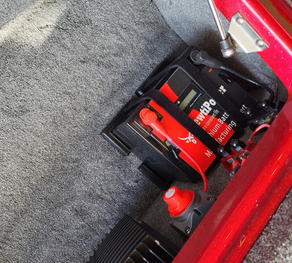 This is where our 4 piece battery tray shines. Simply line it up to the exact size of your battery, and screw into place. Secure the battery with the included Velcro straps and you will never need to worry about your battery bouncing around again!